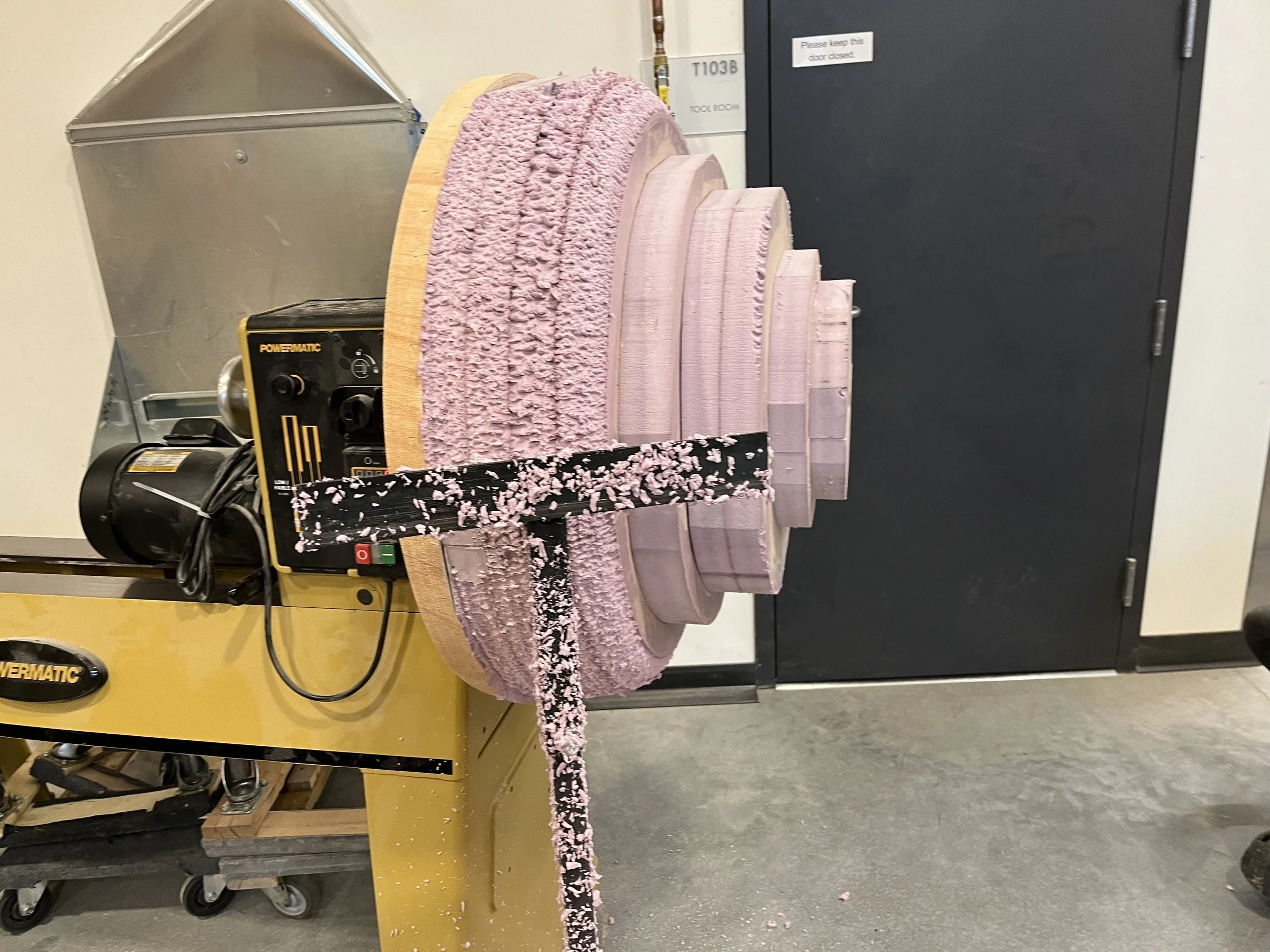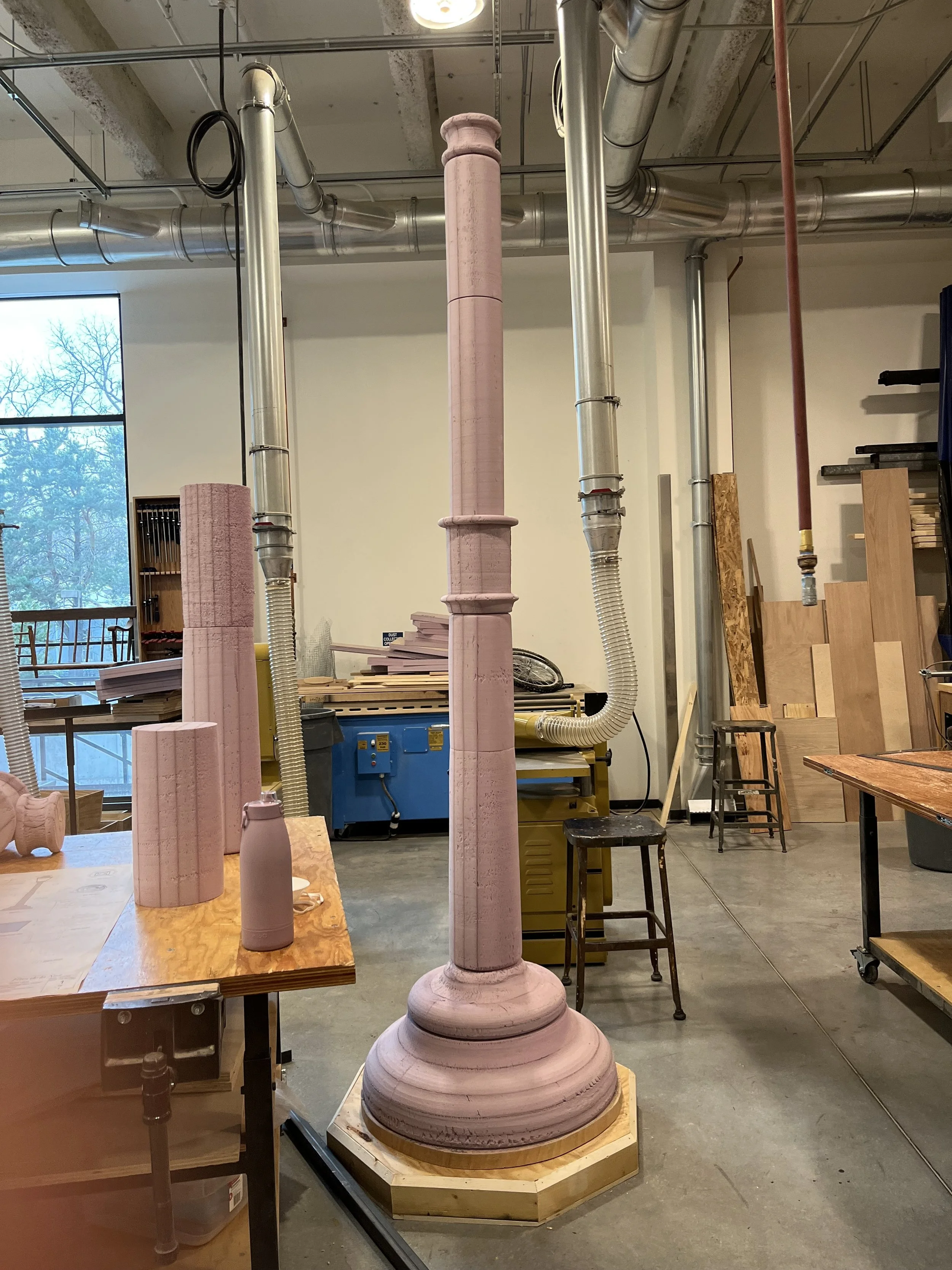 The shape of the lamp is made of insulation foam board turned and sanded to shape. Each lamp has a 2-inch steel tube running down the center as both support and pathway for power and DMX cables for the light inside.