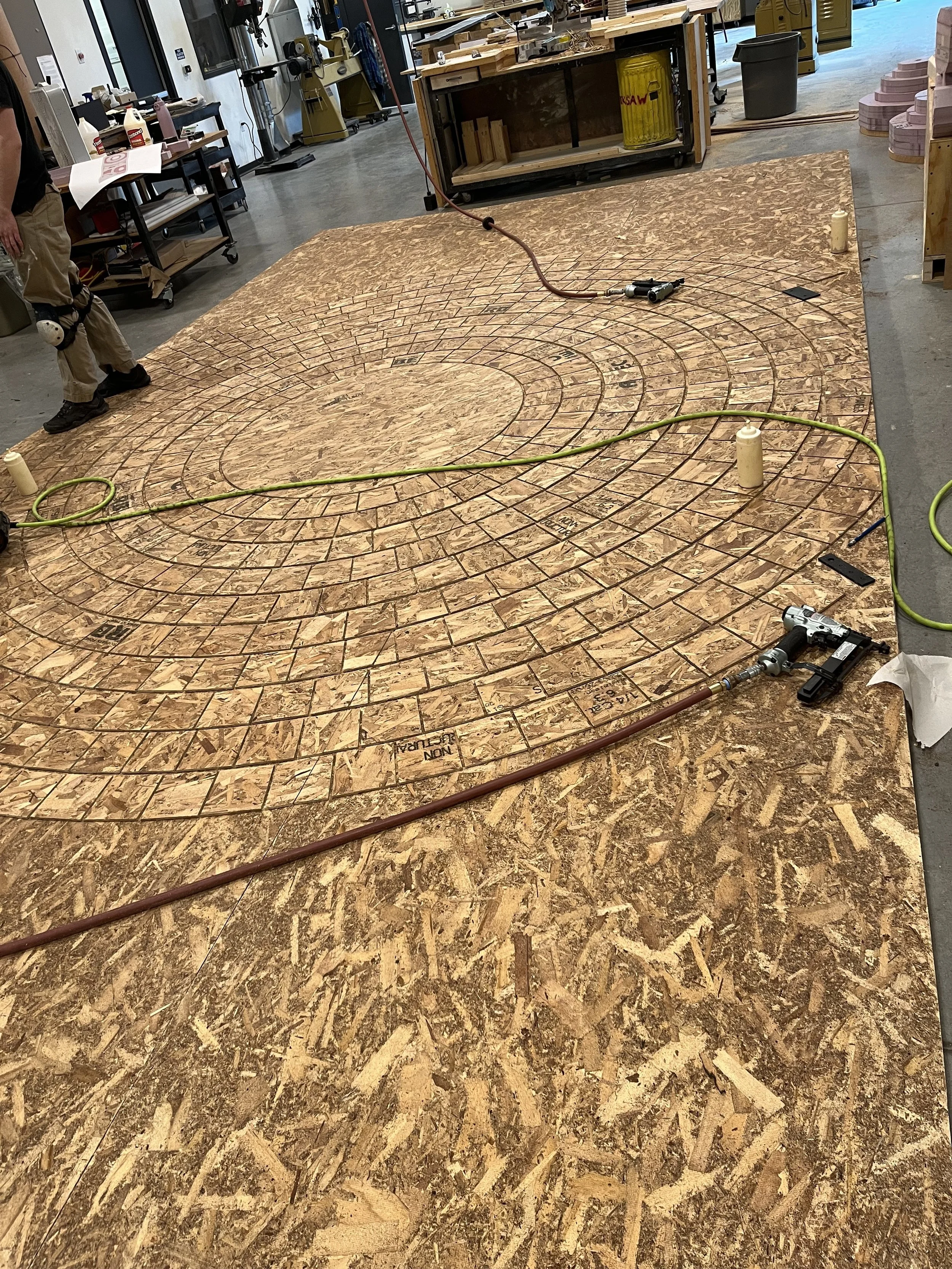 During production meetings, the team determined that the flooring on the main street needs to be three-dimensional and textured. With the audience a few feet away from the acting area, this texturing and elevation are necessary to create a more immersive experience.