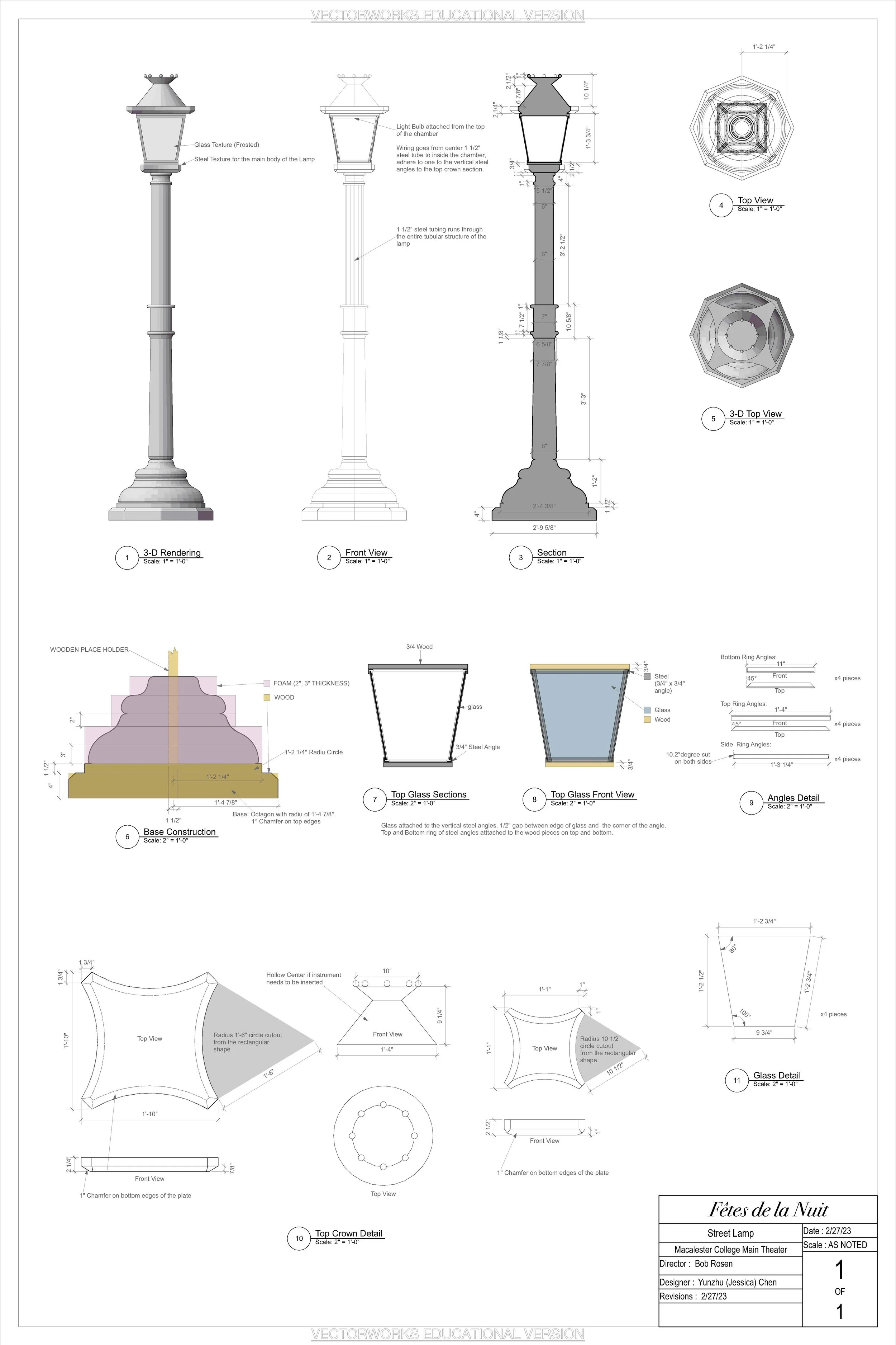 I was assigned the task of designing and drafting the three street lamps. I drew heavily from the existing street lamps on Paris’ street while reducing complexity to accommodate the shop’s capacity to produce the scenic piece practically.