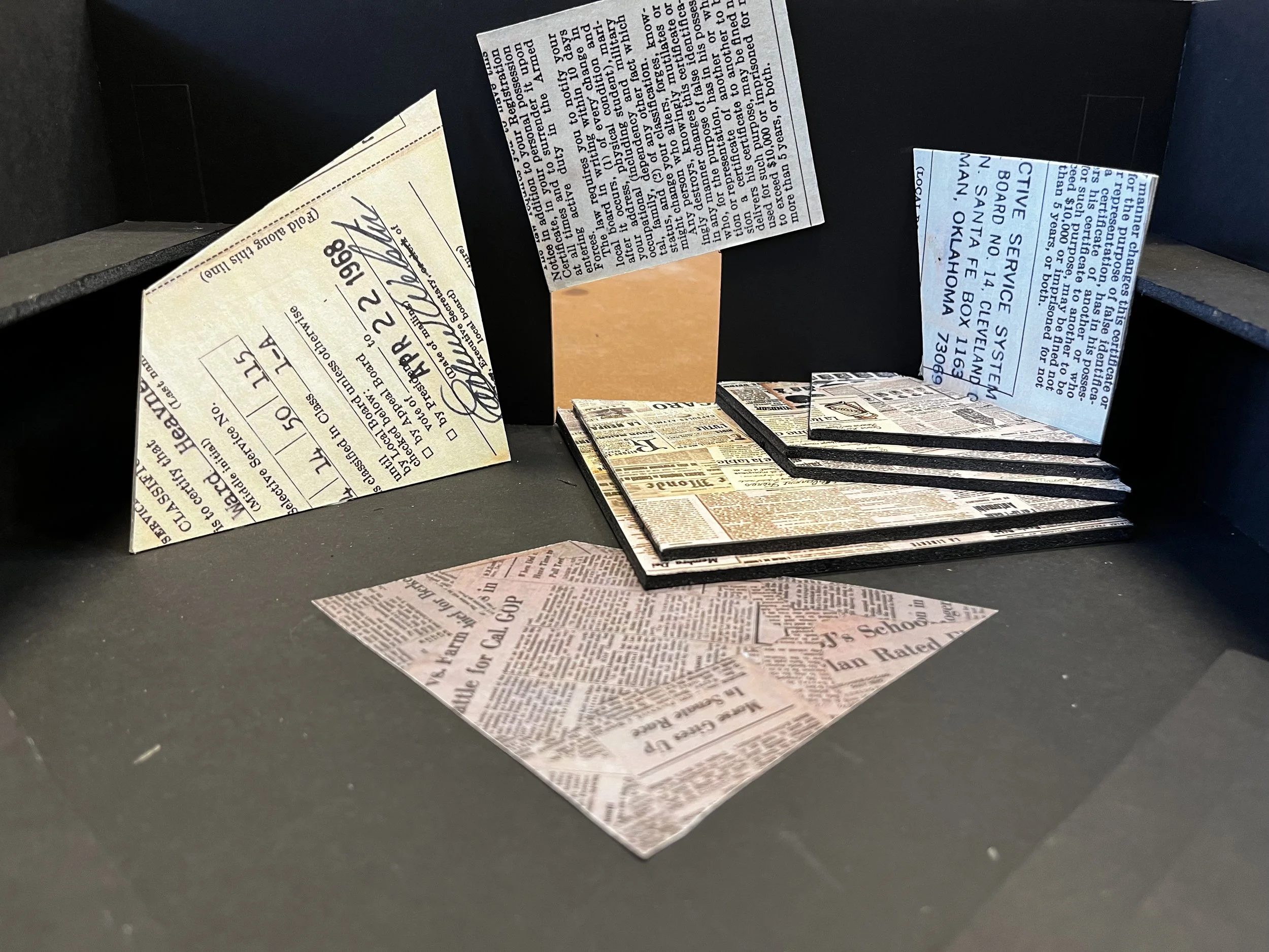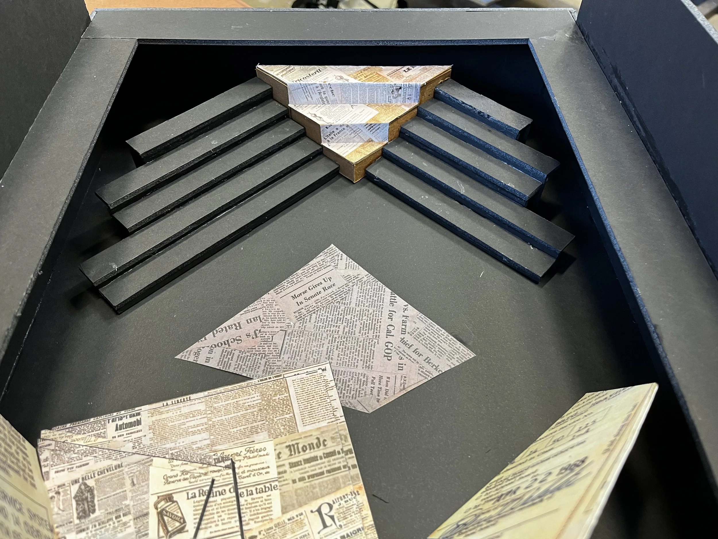 The floor is finished with current daily newspaper collages to further emphasize the historical nature of the play while drawing the connection to modern-day crises, such as the Russo-Ukrainian War.