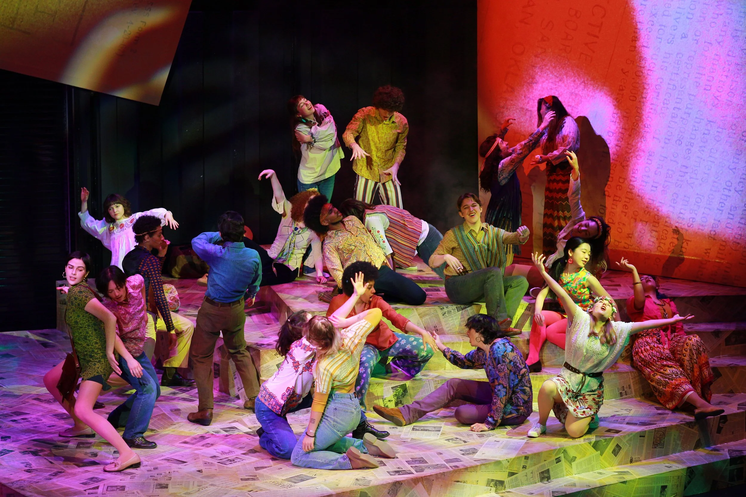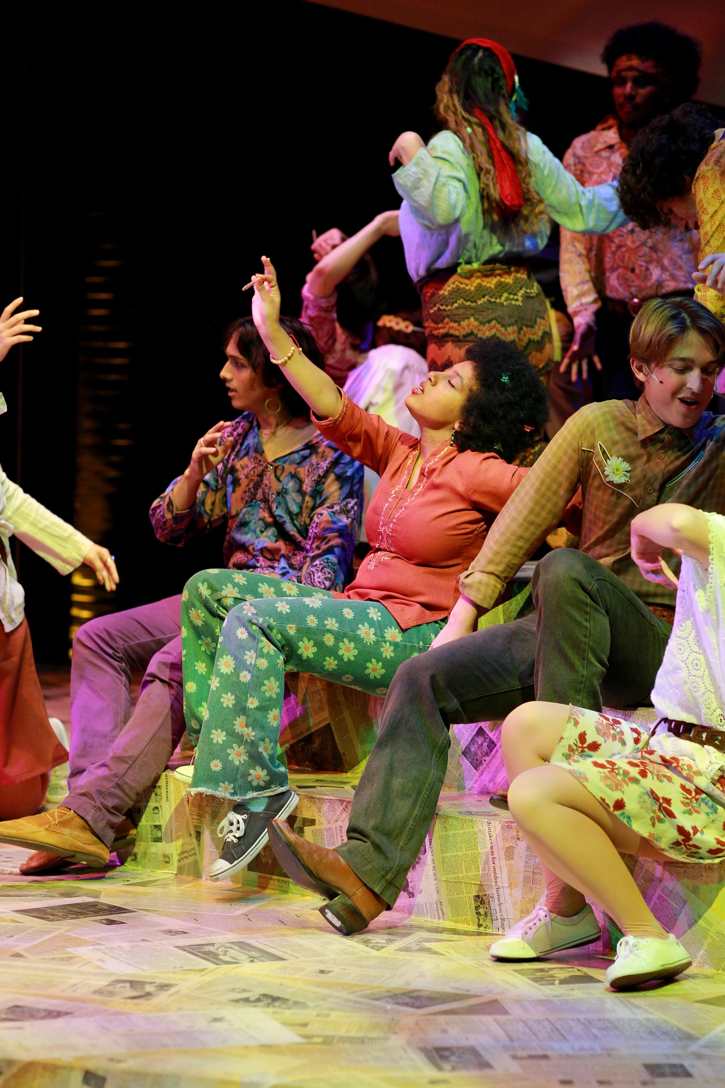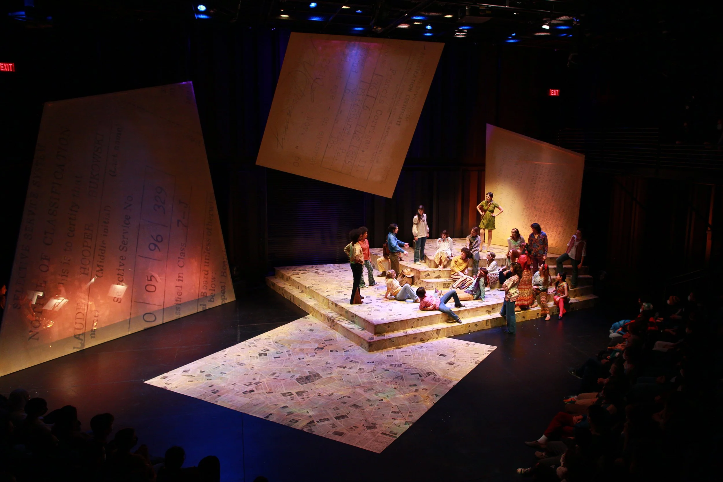 Echoing the draft cards on the projection screens, the deck is faced with treated newspapers. The collage, as well as the draft cards, serves as an underlying reminder to the audience of the troubled reality the young flower children had to face even when they were lost in songs and drugs.