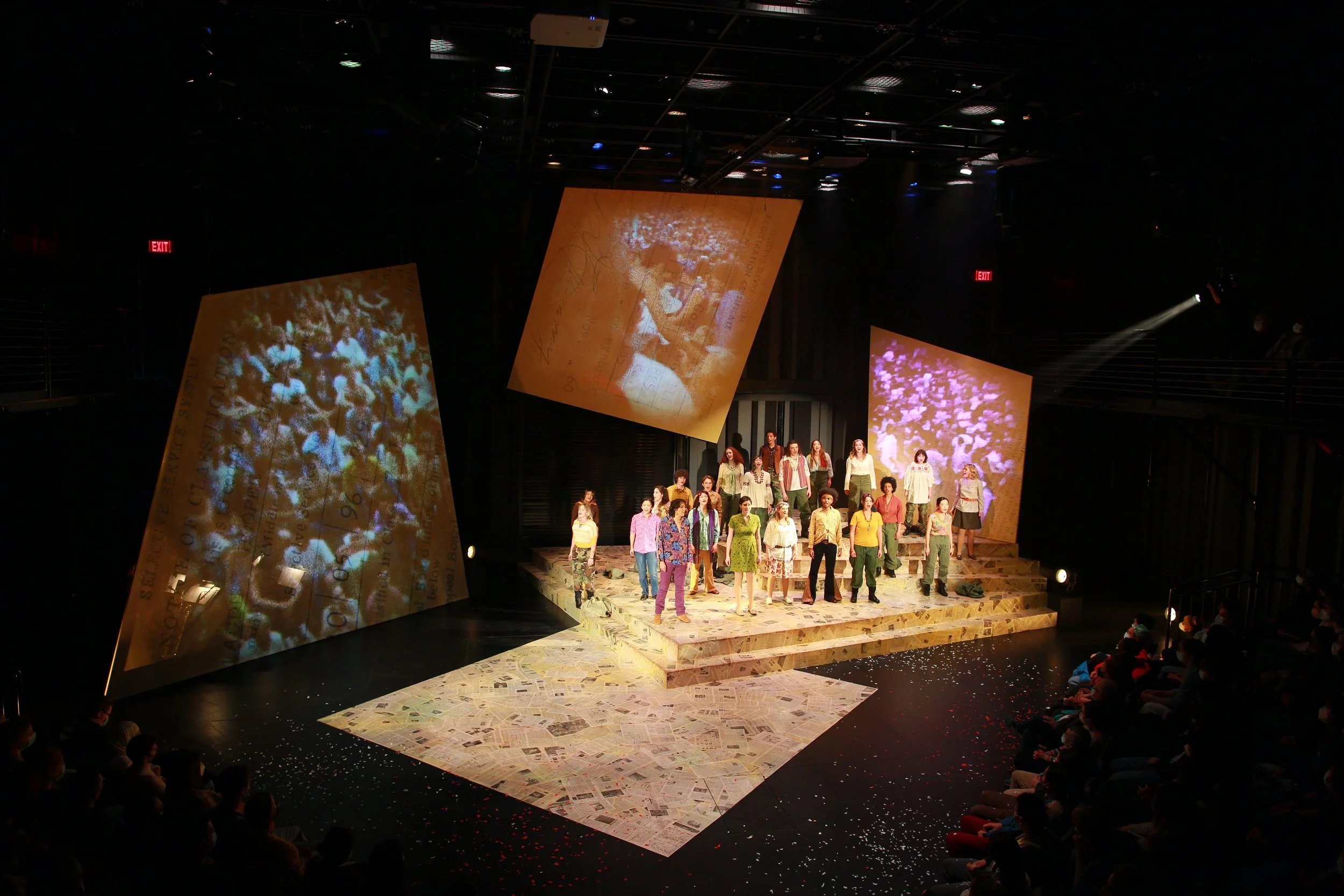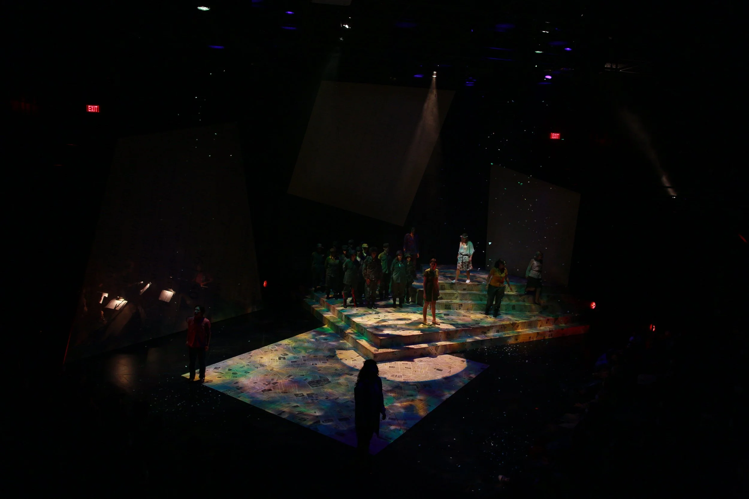 The final design included five giant draft cards as the projection surfaces placed in front and around the audience: three upstage and two on both stage-left and stage-right balconies. This maximized the feeling of immersion in the playing space for the projection designer while feeling like genuine set pieces without projection on them.