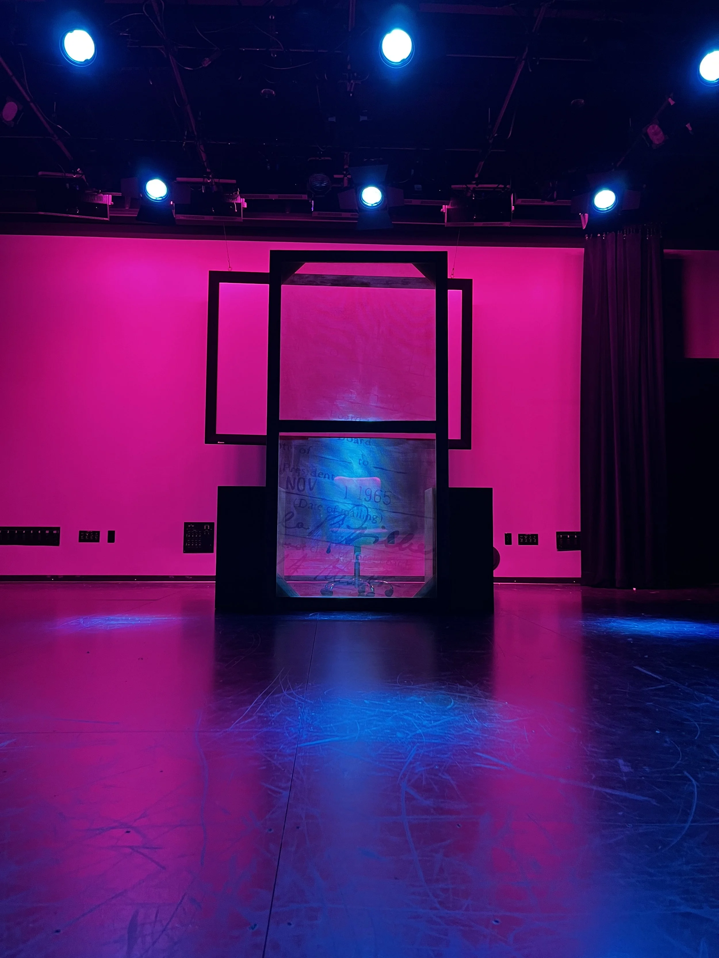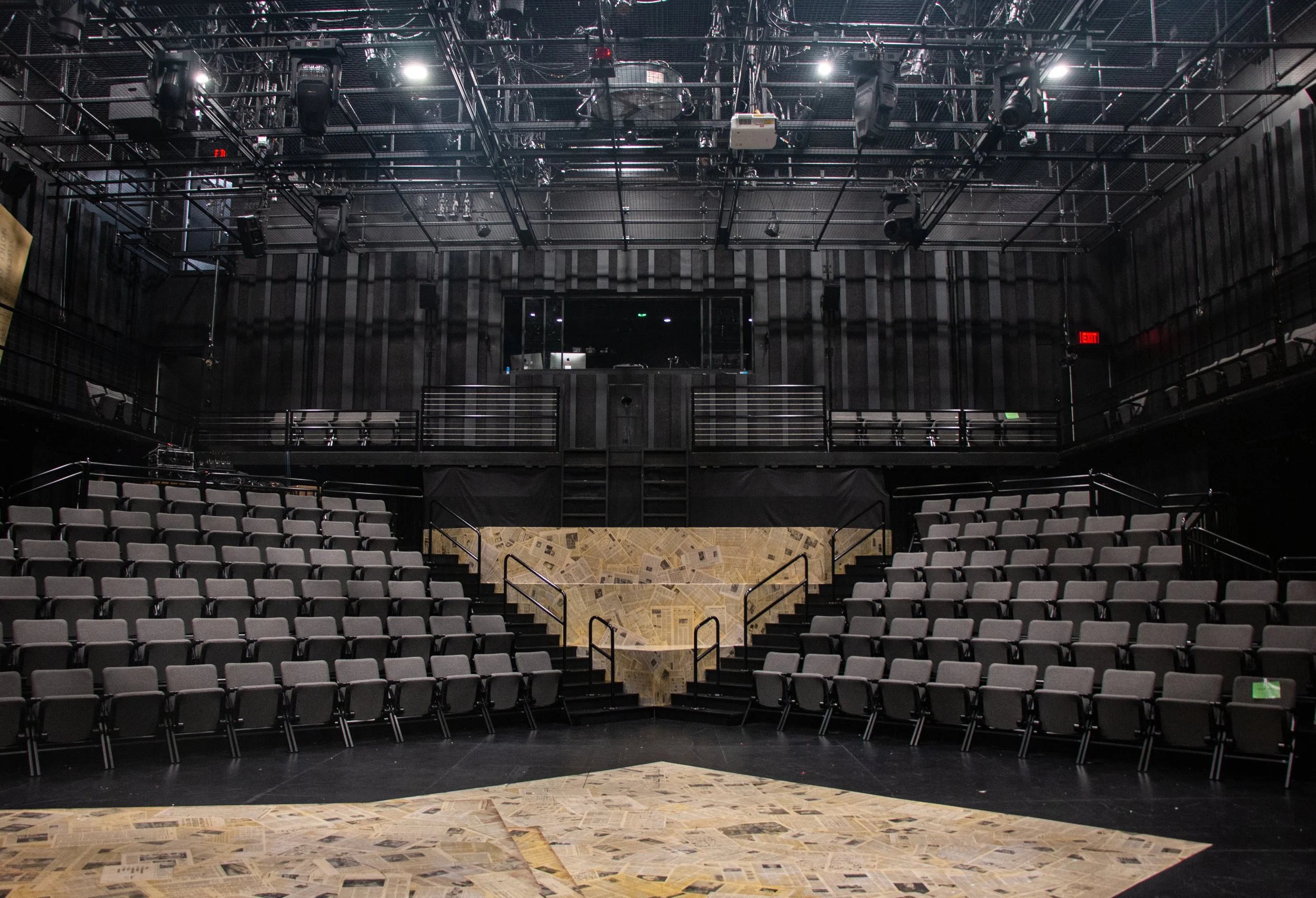 After conversations with the director, it was decided that a sense of community and immersion cannot be achieved through standard proscenium arrangements. Thus, the decision was reached to change to this custom-designed triangular seating arrangement, taking full advantage of the flexibility of the black-box theater.